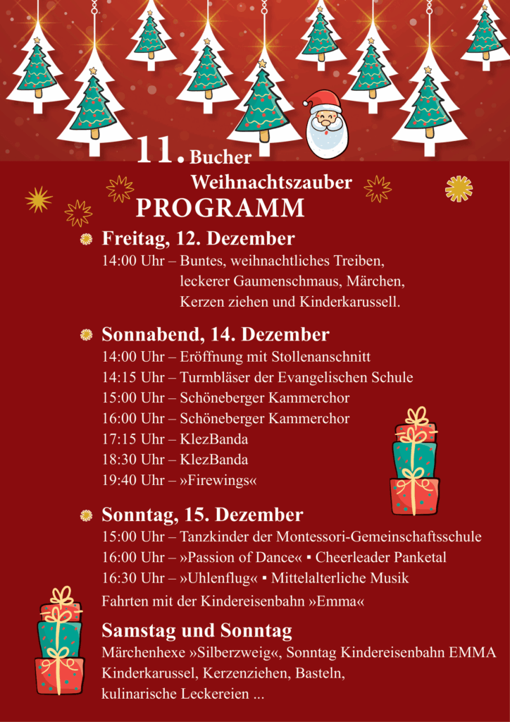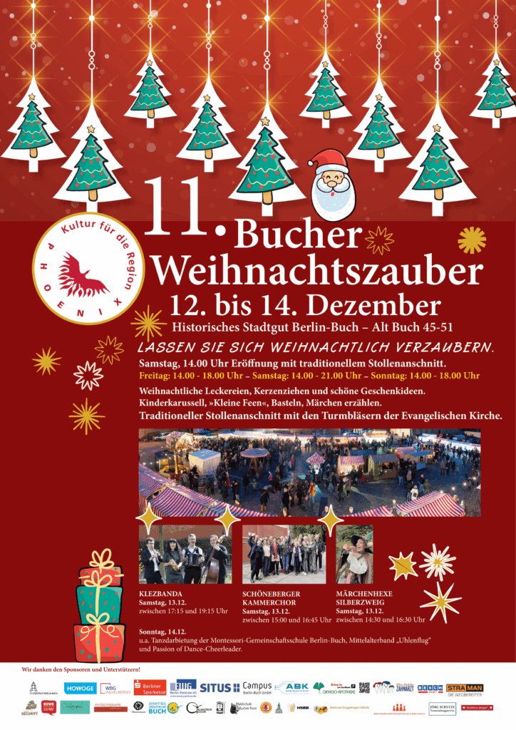 Besuchen Sie den 11. Bucher Weihnachtszauber vom 12. bis 14. Dezember auf dem Historischen Stadtgut Berlin-Buch, Alt Buch 45, und genießen Sie die stimmungsvolle Vorweihnachtszeit!