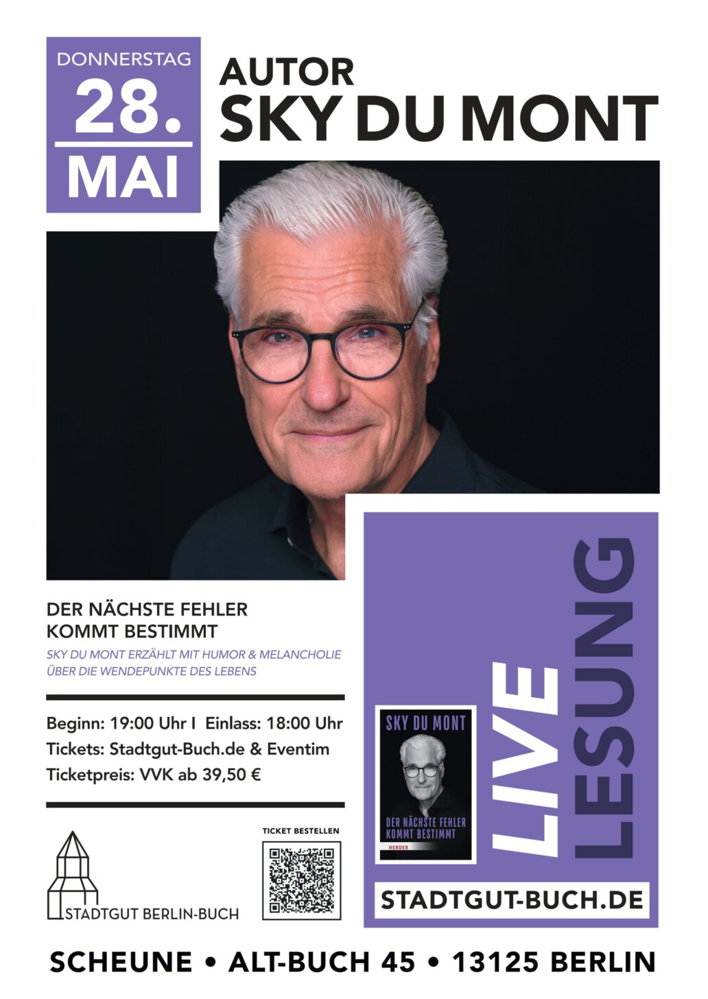 Am 28. Mai ist Sky du Mont zu Gast im Stadtgut Berlin-Buch. Der beliebte Schauspieler und Bestsellerautor präsentiert sein neues Buch – pointiert, humorvoll und mit feinem Gespür für die leisen Zwischentöne des Lebens.